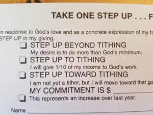 Consecration Sunday comes to its completion this Sunday, March 26. Pastor Mark Huffman, a friend of mine who serves Good Shepherd Lutheran Church in Frederick will be our guest speaker. He too will give his testimony, and when the service is over, he will ask the ushers to hand out what we call “Estimate of Giving” cards. He will ask you to increase your giving over last year. If you remember, Tony Nally showed us a chart a few Sundays ago and asked us to prayerfully consider “stepping up” to a higher level of giving.